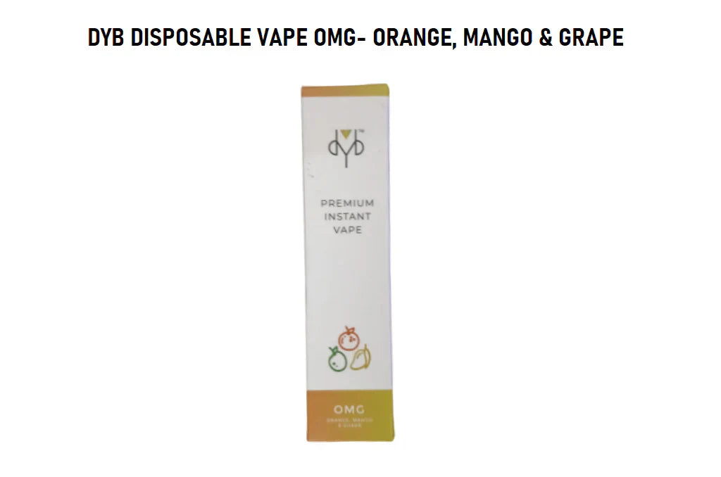OMG - Orange, Mango And Guava brought to you by the DYB team offers. Its a must try disposable DYB vape. Its sleek & modernistic body makes it ultra-compact & portable. Incorporated with 350 puffs 50mg of flavoured e-liquid nicotine which is 95% less harmful than smoking (Research by Health Public UK)